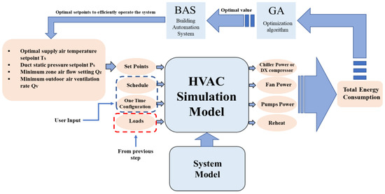 After modeling and optimizing all the components of the selected HVAC system, the whole integrated system optimization process (SLO) developed in this research will optimize the system setpoints over a short period of optimization (15 min). First, the genetic algorithm was used to find the energy used by each system component in the model level (MLO). Later, the integrated components model together will form the system model. Moreover, the total system energy use will be calculated as the output of the system model at each time step in response to the controller setpoints and operating modes.