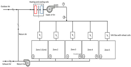 Also, this research will propose implementing the occupancy schedule inputs into the optimization process to account for the actual number of occupants at each time step and reduce the ventilation airflow rates to the exact required amounts. This approach will enhance the sustainability goals of ASHRAE 62.1 [23] by optimizing the zone level ventilation ratio and fulfilling the gap in this related code, as well as reducing the total system energy consumption. In addition, this research will implement the real-time zones occupancy sensor readings. This approach will crucially affect the zones’ ventilation flowrates and zones minimum flowrates. Lastly, this research will implement the method of zone minimum airflow rates setpoint rests. This approach will allow this setpoint to be adjusted over the operation time instead of using the constant design minimum values. This method is crucial to reduce reheat requirements.
