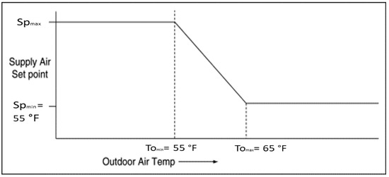 - Zone Minimum airflow rate setpoint. Optimizing the minimum zone air flowrate setpoint will be crucial to reduce the reheat energy. The codes and regulations suggested using 20% of the total design flow rate as a minimum flow rate for each zone. In this research, the zone minimum flowrate range that was examined was from 20–30%. Savings in the reheat energy will be reviewed and discussed later.