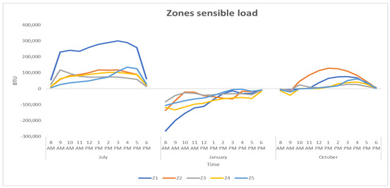 Figure 9 shows the sensible load for the three days analyzed. From the figure, we can tell that the zones were occupied from 8:00 a.m.–6:00 p.m., which was the period that will be examined in this research. It is clear that the five zones required all cooling in July. While in January, they required heating only. In contrast, they required simultaneous heating and cooling in October. That was more likely the case in most of the fall and spring seasons.