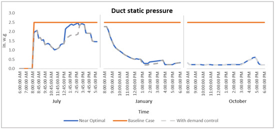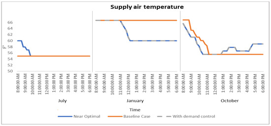 Figure 10 below shows the supply air temperature for the three analyzed days. As previously discussed, as in the best practice, the baseline case will have fixed setpoints of 65 F° (18.3 °C) and 2.5 in.w.g. duct static pressure. While the near-optimal supply air temperature for July was primarily close to the baseline case 55 °F (12.8 °C), which was expected in July, where mainly cooling was required. Except before 10:00 a.m., where the temperature was around 60 °F (15.6 °C), and then starts dropping until it is fixed to 55 °F (12.8 °C). This temperature rise was justified to save on the reheat. The zones were minimally occupied, and the cooling loads were low at that period, thus the zone temperature starts dropping, which will trigger the reheat to be turned on. Raising the supply air temperature will require less chiller power and help maintain the zone setpoints as the boilers were typically turned off in the summer season, thus reheat was not an option.