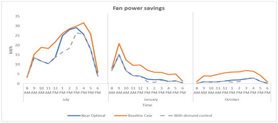 For January, the near-optimal case resulted in a 38.6% savings in the fan power compared to the baseline scenario. In addition, implementing the demand control process has increased the fan power savings to 41% by reducing the minimum zone airflow rate from 20% to 10%.