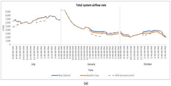The same case implies for October performance. Dropping the supply air temperature for the near-optimal case until 1:00 decreased the heating energy, but it also meant requiring more reheat energy. At the same time, the higher supply air temperature of the baseline case did not necessarily imply requiring zero reheat energy. This was because the baseline case had lower system flow rate, as shown in Figure 13a. As a result, the higher supply air temperature was not enough to meet the zone load. Therefore, more reheat energy was consumed to raise the supply air temperature even more and meet the zone setpoint. Thus, reheat energy savings was still recorded after dropping the supply air temperature for the near-optimal case.