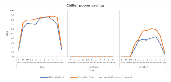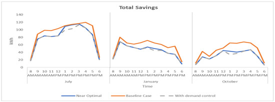 Finally, after examining each component’s savings. The total energy savings of the system was calculated as described in Equation (1). It was found that the total energy savings of the system after implementing the two-level optimization process was calculated to be 11.3% when compared against the baseline case. While implementing the demand control method into the optimization process increased the total energy savings to 13.4% for the selected day in July.