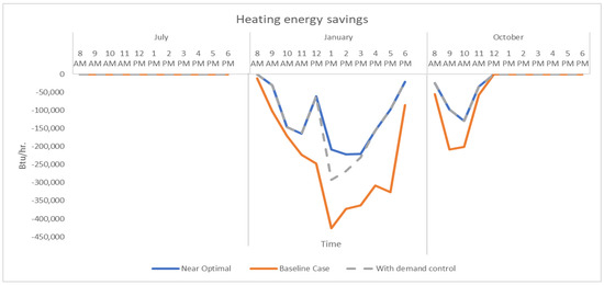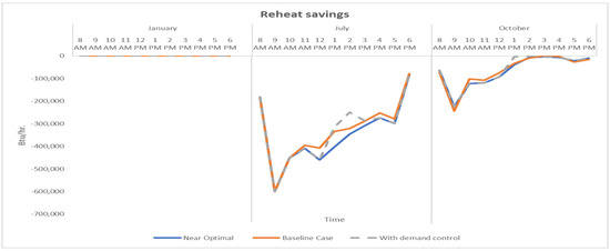 For January, when the supply air temperature was dropped below 65 °F (18.3 °C), the reheat energy was anticipated to increase in the near-optimal case in favor of saving on the heating energy. Thus, the reheat energy increased by 5.4% for the near-optimal case when compared against the baseline. Reseating the supply air temperature increased the reheat energy but significantly reduced the heating energy. Therefore, savings were still achieved
