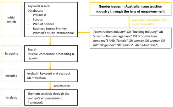 Thirdly, a set of criteria was established to select the relevant articles. Given that empowerment is dependent on external factors that are highly contextual due to a multitude of cultural, religious and regulatory factors, only those studies focused on the Australian context were considered. We further filtered the search by only including studies from peer-reviewed journals, conference proceedings and reports. After these initial filters, articles were further selected by reviewing the abstracts. Articles related to general issues of social procurement, disadvantaged groups or social inequality issues were excluded. While gender inequality and women as minority groups are part of these studies, the interest of this research is only on the issue of women in construction. We also excluded studies related only to masculinity and cultural issues in general, without focusing on women in the construction industry. The replicable process for the systemic review is illustrated in Figure 2.