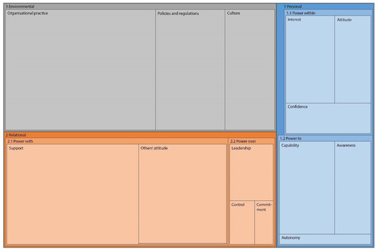 Table 3 shows the number of references and the number of articles coded under each node. The number of references were manually picked after carefully going through all 20 papers and identifying related text in the papers, and they indicate that some factors were heavily researched, while others are much less explored. To illustrate this difference more clearly, Figure 3 presents a hierarchy diagram produced by QRS Nvivo 12. The different sizes of area given to each of these factors (as shown in Figure 3) represent the number of references associated with each (as given in Table 3). It becomes visible that the factors of ‘organisational practice’ and ‘policies and regulations’, under the environmental dimension, together with the factors of ‘support’ and ‘others’ attitudes and behaviour’, under the relational dimension, are of much greater representation than the other factors. The personal dimension in itself received a much lower number of mentions in the studies, although Francis [7] highlights that it is a dimension of great importance. Our study shows how many of these factors, together with other more active relational factors under ‘power over’, have been understudied and deserve greater attention in order to define strategies to better guide women in the construction industry, in addition to the known defined strategies for the industry. The qualitative comments are discussed next.