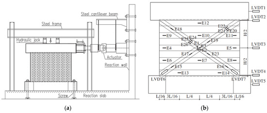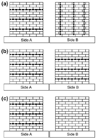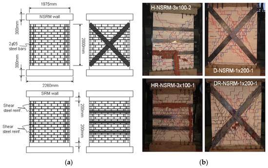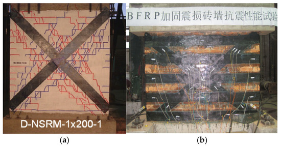 Specimens strengthened by: (a) CFRP strips [30]. Reproduced with permission from Santa-Maria, H., Alcaino, P. Repair of in-plane shear damaged masonry walls with external FRP; published by Elsevier, Construction and Building Materials, 2010. (b) BFRP stripes [31]. Reproduced with permission from Zhou, D.; Lei, Z.; Wang, J. In-plane behavior of seismically damaged masonry walls repaired with external BFRP; published by Elsevier, Composite Structures, 2013.