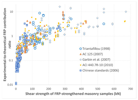 We calculated the means and standard deviations of the experimental-to-theoretical FRP contribution ratios for five different theoretical models and 120 masonry samples (Table 3). These values, as well as the obtained comparison graph (Figure 8), indicate that the theoretical FRP contribution ratios obtained by Triantafillou’s model [45] are the closest to the experimental results, with the mean experimental-to-theoretical FRP contribution ratio equal to 1.07. The second best experimental-to-theoretical ratios for the FRP contribution are obtained for the ACI 440.7R-10 model [53], with a mean value of 1.40. These results, i.e., the mean experimental-to-theoretical FRP contribution ratios larger than 1, indicate that, on average, these models lead to lower values of the shear strengths of the strengthened masonry elements. Even more conservative theoretical estimates are obtained by using the AC 125 [52] and Garbin et al. [49] models, with the mean experimental-to-theoretical FRP contribution ratios of 2.00 and 2.76, respectively. On the other hand, the Chinese standards [50] appear to overestimate the effects of FRP on the shear strength of masonry samples, as the mean experimental-to-theoretical FRP contribution ratio for this model is 0.30 with even 92% of the tested samples having the experimental-to-theoretical FRP contribution ratio less than 1.