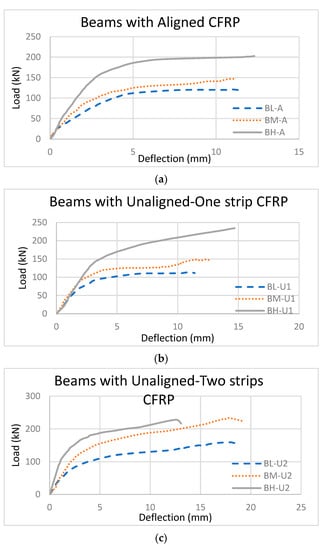 - Experimental load-deflection curves indicated that beams with NSM-CFRP attached have higher ductility than their corresponding control beams as they recorded higher deflection values.
