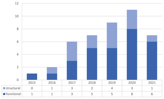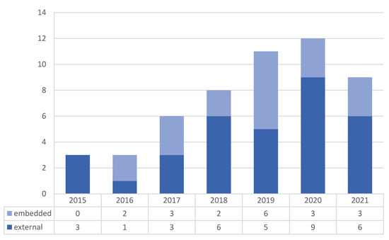 Figure 2 and Figure 3 represent the distribution of publications throughout the considered time interval for embedded and external methods regarding data collection and functional and structural analysis considering data analysis methods. It is important to note that not all papers explore both data collection and data analysis methods in the same work. Therefore, the number of articles in both figures slightly differ, as some works figure in both graphs, while others are only represented in one of them. By analyzing both distributions simultaneously, we can infer their similarity and growing trend. Even though the application of smart technologies to pavement maintenance was already explored widely in the past, including earlier than 2015, these distributions still show a significant growth concerning the interest on the topic at hand in the past 5 years, peaking around 2020 with around 60% of the publications occurring after 2019. Another aspect of note is concerned with the fact that, for 2021, a significant amount of works was already published up until September 2021, demonstrating the increasing interest in these topics.