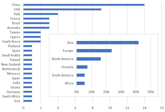 Regarding the geographical distribution represented in Figure 4, the continents that most contributed to these topics for the past five years correspond to Asia, followed by Europe and only then by North America. The biggest contributors in these top three continents are China, U.S.A., and Italy.
