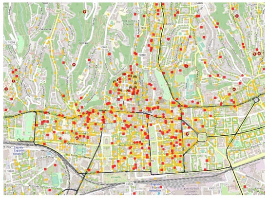 An extensive tramway network is the backbone of the Zagreb public transport system. The tramway infrastructure is a distinct feature of the Zagreb urban complex and has been growing together with the surrounding buildings ever since the first 8 km of the tram track was first laid in 1891 [5]. Figure 1 shows the layout of the tram network and the surrounding earthquake-damaged buildings in the Zagreb historic urban complex. This view of the tram network clearly shows that the tram passes through the very town core, using narrow streets, and it runs very closely to the surrounding buildings. The focus of the paper is on the post-earthquake assessment of tram traffic vibrations’ impact on historic buildings that suffered severe damage and are positioned in the vicinity of tram infrastructure.