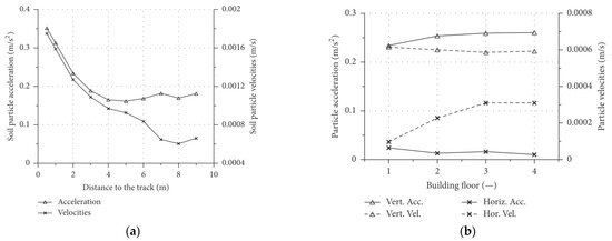 (a) Soil particle acceleration and velocities at different distances from the track; (b) maximum particle velocities and acceleration at different floors of the building [10].