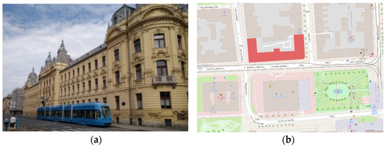 (a) Tram type 2200 passing on the northern track in front of the HŽI head-office building (south wing), (b) with building orientation (red) and tram centreline (black) © OpenStreetMap contributors.