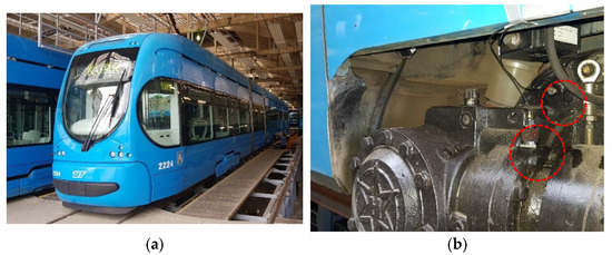 Measurements on tram bogie were conducted to acquire the best insight into vibration characteristics at the source (wheel–rail interface) and to prepare the ground for the long-term monitoring of vibrations on an instrumented in-service vehicle. For the initial testing, measurement was conducted using tram TMK 2224 (low-floor tram constructed by Končar KEV that is the main tram type with a fleet of 140 running within the Zagreb tram network), further referred to as the reference tram, Figure 5. The tram is 70 m long and features 5 modular compartments. It runs on 3 bogies (Bo’Bo’Bo’ arrangement), out of which the central bogie was instrumented with accelerometers on the left and right sides of the bogie in both vertical and transverse direction as described below: