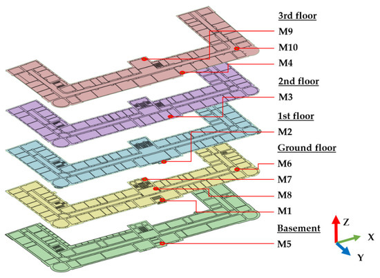 The HŽI head office building is composed of three wings (east, south, and west) and five stories (basement, ground floor, first floor, second floor, and third floor). After the initial inspection of the building, its layout, and damage suffered in the earthquake, ten measurement positions for placing triaxial accelerometers were defined, as shown in Figure 6. Measurement locations were mostly distributed throughout the south wing of the structure because it is the closest to the tram line: