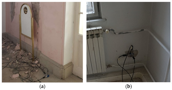 As a result of the M5.5 earthquake that hit Zagreb, the building suffered considerable damage at the level of the central staircase, partition walls, and load-bearing walls on higher floors of the building, Figure 4. The south wing was marked as temporarily unusable (PN2) according to the rapid post-earthquake assessment described in [27], while the east and west wings were marked as usable (U2) with minor damage. The building is also situated in the immediate vicinity of the tram track passing through Mihanovićeva street. The centreline of the closer track is situated only 5 m away from the facade of the building. Since the south wing, closest to the track, was completely evacuated after the earthquake, with the permission of HŽI, it served as an optimum location for performing an initial investigation of the influence of tram vibrations on the earthquake-damaged building.