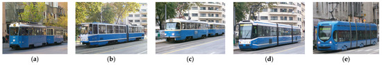 Tram types considered in evaluation: (a) TMK201, (b) TMK 301-KT4, (c) TMK 401-T4, (d) TMK2100, and (e) TMK2200 [28].