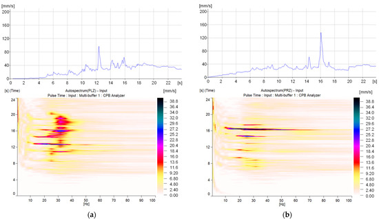 Vibration trend (top) and 3D spectrogram (bottom) of vertical vibration velocities in the second pass-by: (a) left side—PLZ; (b) right side—PRZ.