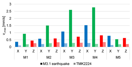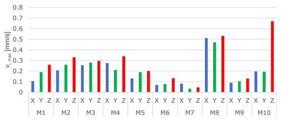 Four pass-bys described in Section 3.1 were also recorded at ten measuring positions in the masonry building. To compare four consecutive pass-bys of the reference tram, peak vibration levels (up to 100 Hz) were determined based on the waveform signal. Peak velocity values (vi, max) for the second pass-by (with highest vibration levels) are presented for each location and direction in Figure 10.