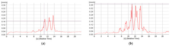 All acquired acceleration signals were post-processed in the frequency range of interest, i.e., from 0.5 to 100 Hz, in which the tram-related excitation is expected according to [21]. The vibration amplitude was calculated in 1/16 of a second intervals to obtain the peak vibration level and vibration trends. Vibrations were expressed as both accelerations in m/s2 and as velocities in mm/s (integrated from acquired acceleration signal).