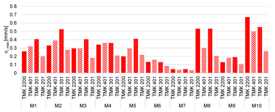 By comparing four pass-bys, the highest vibration amplitudes can be observed in the vertical (Z) direction. Additionally, for all pass-bys, maximum levels were measured at location M10. For each of the tram types, vibrations at M8 are similar in amplitude for all directions. As to the south-central axis (M1–M5), the highest vibrations were induced by TMK 301 tram. Overall maximum vibration levels were induced by TMK 2200 at M10.