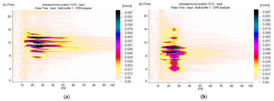 Three-dimensional spectrograms of vibration velocities at M10, vertical direction (Z), for trams (a) TMK 2200 and (b) TMK 301.