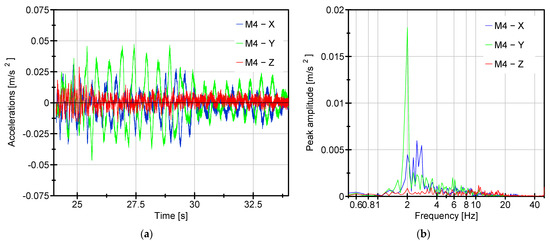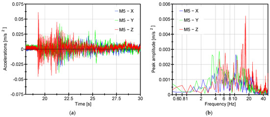 While measuring tram vibrations, a 3.1 (ML) earthquake struck Zagreb at roughly the same epicentre [30]. It was, therefore, interesting to compare the effect of earthquake action and tram action on the same building. The seismic action of this earthquake can be represented as a response of building foundations (M5), Figure 14. The waveform and frequency analysis reveals the nature of earthquake activity, which is much lower in frequency compared to tram excitation, around 4–18 Hz, primarily in the Y direction. Building response can be monitored through different floors in the same cross-section. Frequency analysis reveals that building response is dominant in 2–3 Hz, especially at higher floors (M3 and M4), Figure 15. This distinct response was not observed with tram excitation due to the much higher frequency and lower amplitude of induced vibrations.