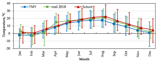 Poland has a temperate climate with cold winters and warm summers. The heating season typically lasts from September to May; the number of heating degree days is about 3743 (°C·day). Three different climate models were used for the analyses. In the first case, it was a TMY weather file, developed by the Polish Ministry of Infrastructure for use in energy calculations for buildings [35] based on the 30-year data (1971 to 2000) from the Institute of Meteorology and Water Management (IMGW), for the city of Katowice, located 60 km from Skoczów (TMY) [36]. This is the nearest location to the building with TMY data available. The annual outdoor temperature ranges from −18.3 °C to 30.8 °C, with an average of 8.0 °C. The second weather file was built on the real climate data from 2018 for the city of Bielsko-Biała, located 20 km from Skoczów (real 2018). This is the nearest location to the building with the available current weather data of the IMGW. The annual outdoor temperature ranges from −16.7 °C to 32 °C, with an average of 10.1 °C. The comparison of these two types of climates was to check whether the use of publicly available standard climate data did not significantly affect the simulation results when compared with the data from the analyzed period of time. The future climate was selected as the third climate, due to the noticeable warming-up in recent years and further projected warming. Based on the first climate and the A2 scenario, the warmer climate for 2050 was generated. It was prepared in the generally available CCWorldWeatherGen program [37], which is based on the morphing of historical observation. Annual, outdoor temperature ranges from −13.8 °C to 37.6 °C, with an average of 11.0 °C (future). Climate data of these three cases were prepared in weather file format—The EPW file [38]. EPW (Energy Plus Weather) is a typical file format commonly used in the EnergyPlus program. It is a text-based CSV file that contains a year-worth of hourly weather variables for a given location. Weather variables include temperature, dew point, global horizontal radiation, diffuse solar radiation, wind speed, and wind direction. The EPW file can be used in different simulation programs such as ESP-r [39], IES [40], and TAS [27,41]. Figure 3 presents the comparison of minimum, average, maximum monthly exterior temperature.