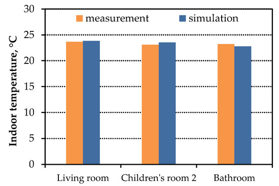 In order to verify the thermal model, the indoor temperature measurement campaign was carried out in September 2018. The measurements were conducted with 15 min time step using Apar235 recorders (measuring range: −30–80 °C, measuring accuracy: ±0.5 °C in the range 20–30 °C and ±0.5–1.8 °C in the remaining range) in four selected rooms (living room, children’s room 2, bathroom on 1st floor, and unheated attic). During the measurement, there were three occupants (two adults and child) in the building. For that reason, a separate schedule (based on the actual recording of staying occupants) of the heat gains was prepared to validate the model. The comparison of measured and simulated indoor temperature is shown in Figure 4. The article by Sarna et al. [42] describes in detail the process of model validation and calibration.
