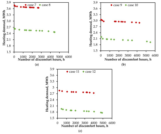 The extreme case with the lowest heating demand was when the windows were not opened in the building or the windows were opened very rarely. It is rather a theoretical case because in a building with natural ventilation people often open windows from spring to autumn. The lower the heating demand the higher the number of thermal discomfort hours, and the more insulated the building the higher discomfort. Each subsequent point in Figure 7 indicates a possible solution to improve comfort conditions. Using a large regime for window opening in appropriate periods caused a significant improvement of thermal comfort conditions. The Hdis for the best solutions due to the heating demand varied from 2699 to 5471 h of discomfort depending on the considered case (it was from 19% to 38% of the cumulative time spent in the rooms). This comparison best shows how building insulation and climate change affect the Hdis. While the differences between heating demand in optimal solutions were from 118 to 263 kWh, the highest value was only from 3% to 12% less than the lowest. Better conditions for the use of this cooling system occur in a less insulated building (this can be seen especially in warmer climates). For case 9 in the most favorable solution from the comfort point of view (minimum value of Hdis) 31 discomfort hours were calculated; for a passive standard building, it was 52 h (case 10). For cases 11 and 12, minimum value of Hdis increased, it was 203 and 433 h of discomfort, respectively. Compared to real climate 2018 it was six and half times greater (case 11) and more than eight times greater (case 12). Along with the warming of the climate, passive cooling of the building will be able to provide comfort for a smaller period per year.