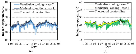 The aim of both cooling systems was maintenance of comfort temperature in range of the 2nd category of the adaptive model (as the most recommended category for energy calculations [44]).