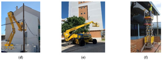 In terms of aerial work platforms, articulated booms (Figure 1d), telescopic booms (Figure 1e), and scissor lifts (Figure 1f) are the most common. Aerial work platforms are motorised vehicles and have reduced installation times. However, the weather conditions can also influence the performance and safety of this means of access, particularly the incidence of wind. Moreover, the ground surrounding the façade should have sufficient strength to support the equipment [14]. The work platform of the articulated and telescopic booms extends (vertical and horizontal) beyond the wheelbase of the supporting structure while scissor lifts are elevating platforms (only with vertical movement) [22]. These means of access are normally used in occasional and short-term maintenance operations in low-to-medium-height buildings. The reach of these equipment types is reduced when compared with the other means of access (approximately 20 m to articulated and telescopic booms, and 10 m to scissor lifts) [17,22].