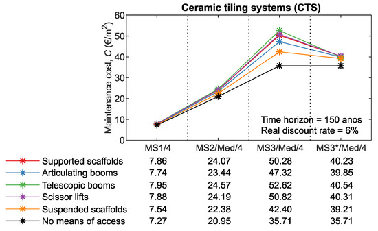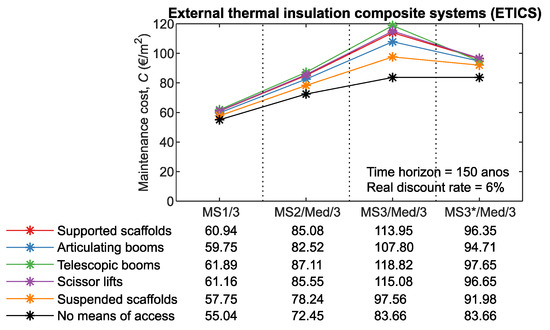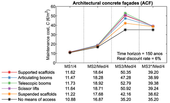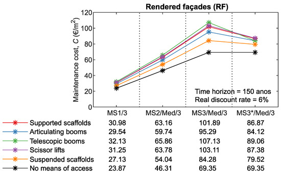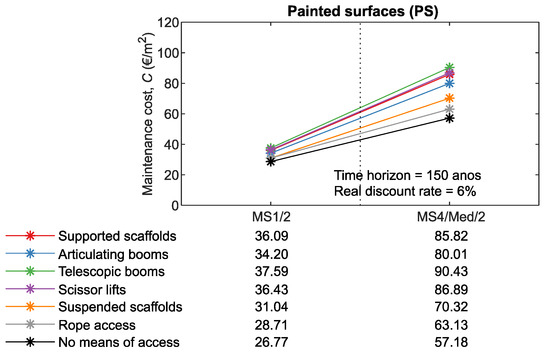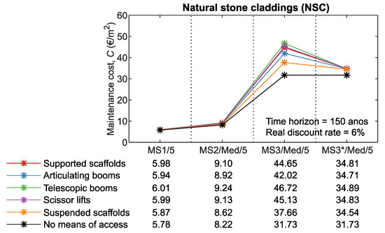 For example, the impact on maintenance costs on MS3 is higher than on MS2 or MS1 (the number of interventions increases with the complexity of the maintenance strategy). In addition, for RF and PS (claddings with reduced service life and, consequently, higher number of interventions during the time horizon), the impact on maintenance costs is higher than for the remaining claddings (CTS, NSC, ETICS, and ACF). For RF/MS3 and PS/MS4, the costs of the means of access can represent a third of the maintenance costs. Furthermore, it is also found that the use of rope access to carry out cleaning operations has a significant impact on maintenance costs. For the 150-year time horizon, there is an average reduction of 20% in maintenance costs for CTS, NSC, and ACF, and 15% for RF and ETICS.