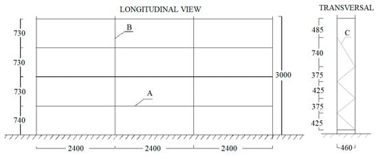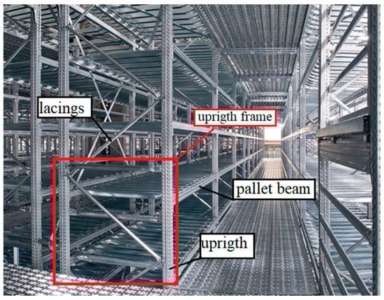 Racks are typically made of thin-walled steel members (TWCF), obtained from coils cold-rolled in continuum [,]. An example of a typical rack is sketched in Figure 1, which is obtained by a regular sequence of upright frames connected to each other by pairs of pallet beams carrying the stored units. Moreover, the presence of nonlinear partial strength semi-rigid connections, the regular perforation systems along the uprights, the extensive use of monosymmetric members, and both geometrical and mechanical imperfections do not allow for a design based on pure theoretical approaches []. For these reasons, the European rack design code EN15512 [] recommends the so-called design-assisted-by-testing procedure [], which combines theoretical approaches developed for more traditional steel carpentry frames with experimental data able to represent the response of joints and components. In particular, specific tests are required to evaluate: