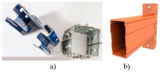 - The effective properties of the structural elements. Uprights and beams are cold-formed thin-walled elements, whose shape (Figure 2) strictly depends on rack producers. The beams have a boxed cross-section shape usually defined by the need to guarantee adequate support to the pallet units. Uprights are generally mono-symmetric cross-section members characterized by a set of regular perforations along with their height. For this reason, the effective properties (effective second moment of area and net area) have to be always experimentally evaluated [].