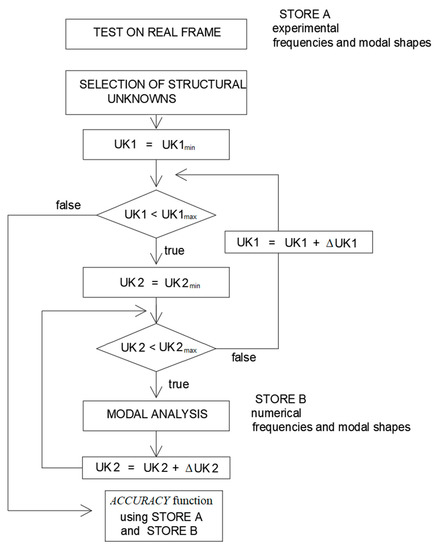 The flowchart of the procedure is depicted in Figure 3 with reference to the case of two structural unknowns, identified as UK1 and UK2. For each of them, i.e., UKj, a set of values ranging from a minimum UKjmin and maximum UKjmax value, is considered with an increment of UKj. The range of variability, i.e., the values assigned to UKjmin and UKjmax is strictly related to the sensibility of the operator. If the experience in this field is limited these values should range from 0 to a value close to ∞, with a great amount of time consuming. As an example, if the beam-to-column connections were considered, the EN1993-1-8 [] boundary limits of semi-rigid connections could be used as a suitable range.