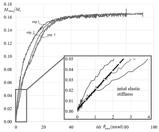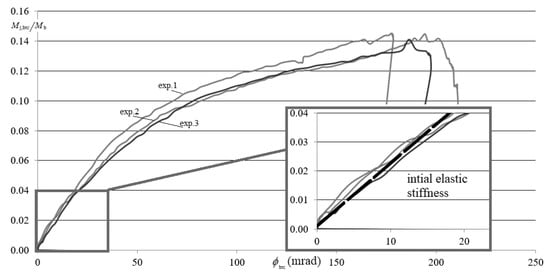 For baseplate connections, test results on three nominally equal specimens are available from the past research. The associated experimental curves are reported in Figure 6, in terms of relationships between the base-plate connection bending moment () divided by the resistant bending moment of the upright (Mc) versus rotation . Like for beam-to-column joints, initial elastic stiffness () is represented by a dashed thick black line, corresponding to the value of 2.21 × 106 Nmm/rad, which is the unknown stiffness to approximate via the characterization procedure.