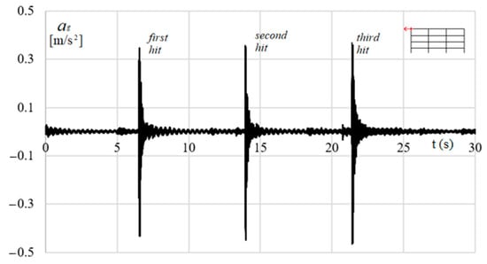 Two impact hammers were rigidly connected at the top of the rack in the longitudinal and transversal direction (Figure 7b). The height of falling and the excitation mass are 250 mm and 0.3 kg, respectively; therefore, the input energy was always constant during tests in order to guarantee that all test data are coherent to each other. The accelerations were recorded with a sampling frequency of 6400 Hz (= 0.156 ms).