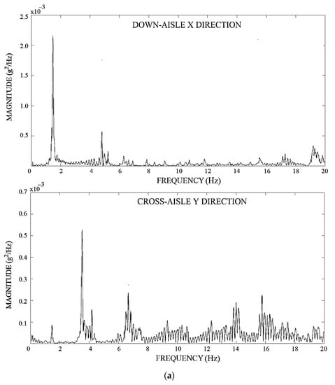 The final signal was elaborated by using the well-known Frequency Domain Decomposition (FDD) technique [], paying attention to separate the predominant structural frequencies from external noise. In Figure 8 and Figure 9 the obtained results in term of accelerations, frequencies, and deformed modal shapes are reported, which are related to the longitudinal and transversal direction, respectively. For the damping evaluation, reference has been made to the bandwidth method [], which ensures a good estimation of the modal damping coefficient associated to each modal shape highlighted on the frequency domain.
