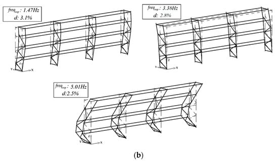 Key data related to the rack modal identification: (a) identified frequencies and (b) selected deformed shapes.