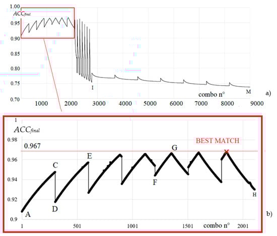 where t is the average time taken by the computer to perform one iteration (approximately 10 s) and Ntot is the number of the iterations (for the considered case Ntot = 7 × 1297 = 9079). In total 25 h approximately have been required for the FE simulations associated with the present case studio. Final results are plotted in Figure 10, where for each trial combination, identified by a number ranging from 1 to 9079, the value of the associated accuracy parameter (ACCfinal) is reported.