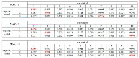 In particular, according to the well-established MAC definition proposed in the literature, the correlation between two sets of modal vectors ϕA,num (numerical set) and ϕA,exp (experimental set) can be evaluated by computing a matrix (MAC matrix) as: