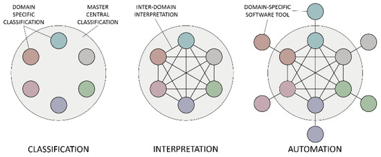 The proposed theoretical framework for interdisciplinary data exchange is based on three parts: (i) classification, (ii) interpretation and (iii) automation. The classification part defines the terminology and domain-specific requirements. Semantical and geometrical properties of building elements are clearly distinguished within the classification system [42] as they undergo different interpretations. The interpretation part defines the relations between domain-specific classification systems, including the semantical and geometrical interpretations. The interpretations support the transition from one to another domain-specific classification system and corresponding data. This process can be fully or partially automated. The classification and interpretation parts take place in central storage and are not dependent on proprietary software tools. Finally, the automation part implies automatic communication between the domain-specific models on the central database with the proprietary models and software tools. The concept of the new framework can be compared to the IFC-based data exchange with, however, several key differences: classification is developed as domain-specific and interpretations take place between multiple centrally-stored domain-specific models, while the popular IFC subschemas called model view definitions (MVD) and IFC involve multiple domains, and the interdisciplinary interpretations are not formalized. Proprietary domain-specific tools in our concept communicate with the domain-specific models. The idea is similar to the MVDs which have not been developed as domain-specific and the interpretations between them have not been considered [6]. An additional difference is that the data exchange is not file-based. Figure 1 depicts different parts within the framework.