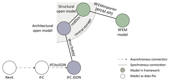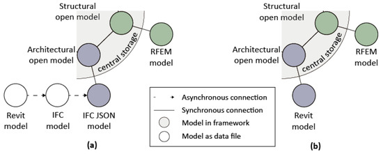 Models can be connected in asynchronous or static and synchronous or dynamic way. Synchronous connection means that a storage (containing a model) or a software tool can be subscribed to another storage or tool and the changes made in the native tool or storage are recognized and updated in the receiving one. On the other hand, asynchronous connection does not allow automatic information updates, and the exchange process must be repeated in order to display the changes. In the described system, synchronous connection represents a connection via an API (application programming interface), while file-based exchange is considered asynchronous. A non-proprietary IFC building model is a starting point in the data exchange framework. A corresponding flexible system architecture can be used with all software tools supporting export to IFC (Figure 2a). However, it does not provide a synchronous connection between the native model in Revit or architectural model in IFC and the central storage, and some data losses and inconsistencies take place during the export from native to IFC models.