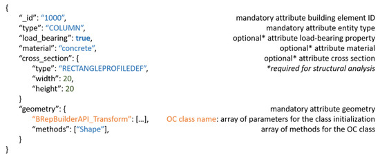 Classification defines an underlying structure of building models, in this case architectural and structural building models. We opted for MongoDB and JSON, deeming it appropriate for the heterogeneous building models. MongoDB uses documents and groups them in various collections. A data-exchange workflow would benefit from the clear distinction between geometrical and semantic data [42]; therefore, these two types of data are treated separately within the JSON document. The main shared characteristics are that they describe the same building element and both are defined with the JSON format. An example of a building element is presented in Figure 3.