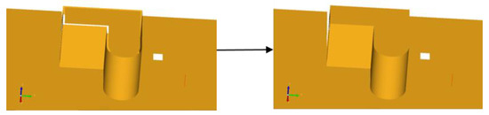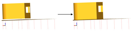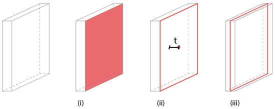 Planar elements in PM are walls and slabs (including flat roof), both represented as topological shapes of OC, some containing openings. The planarization method involved (Figure 8): (i) largest face of the shape is located; (ii) the element thickness is found by analyzing distances from the central face vertex to its projection on the neighboring surfaces; and (iii) the largest face is offset for half of the thickness to the inner part of the topological element. The result is a planar element axis as the OC face. Analytical representation of openings is an intersection between the physical opening geometry and planarized host element, so it would be coplanar with the host element surface.