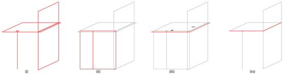 The intersections of parallel walls with the same thickness do not exist (Table 8a). However, parallel walls were present in the lists with neighbors and since it is a standard modelling approach redDim required an extension—the neighbors are tested for their parallelism and divided into two groups. Linear elements are parallel if their main directions are same, and planar if their normals to the face are parallel. Linear and planar neighbors are considered parallel if the direction of linear element is orthogonal to the normal of the planar face.