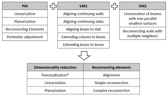 The overview of the interpretations and final summary is presented in Figure 14. The required interpretations can be categorized into two groups: dimensionality reduction and reconnection of elements. Dimensionality reduction is defined with linearization and planarization. We also previously recognized the need for punctualization (marked with *), where 3D elements are represented as points; however, this method was not present in the tested models. On the other hand connections between the elements need to be reestablished. In the analyzed models, three reconnection methods were identified: aligning parallel building elements, simple reconnection of elements with low number of neighboring elements and complex reconnection (or in PM perimeter adjustment) where each edge of the building element is tested individually. This overview gives the final proposal for the geometrical interpretations between physical and analytical models. As the main motivation is to realize the non-proprietary interpretations, the methods allow editing and extending if other workflows or geometries require changes. However, based on the verification results, the proposed methods cover most building elements and geometries found in building models.